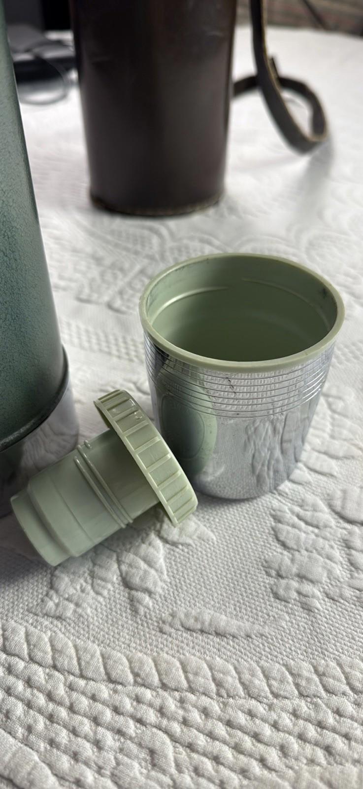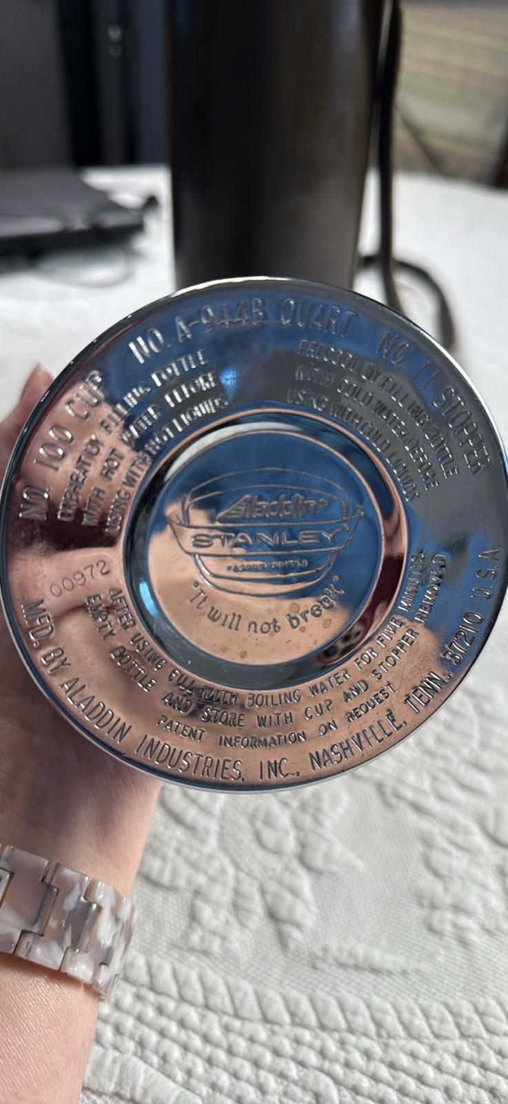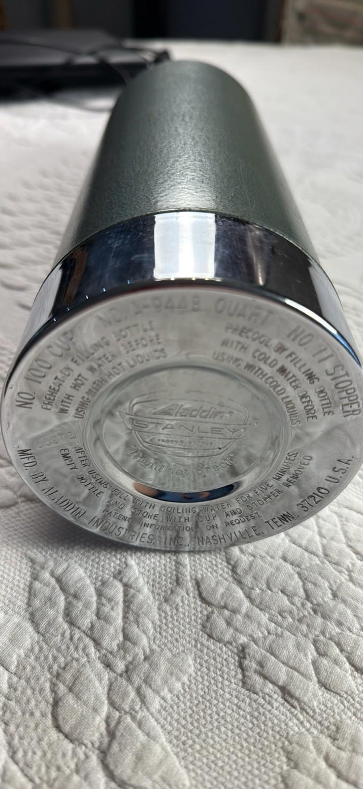 Metal engraving on the bottom says “it will not break. Made in the USA. Number 100 cup, number 8–9 44 B quart, #11 stopper, manufactured by Aladdin industries, Nashville, Tennessee.
